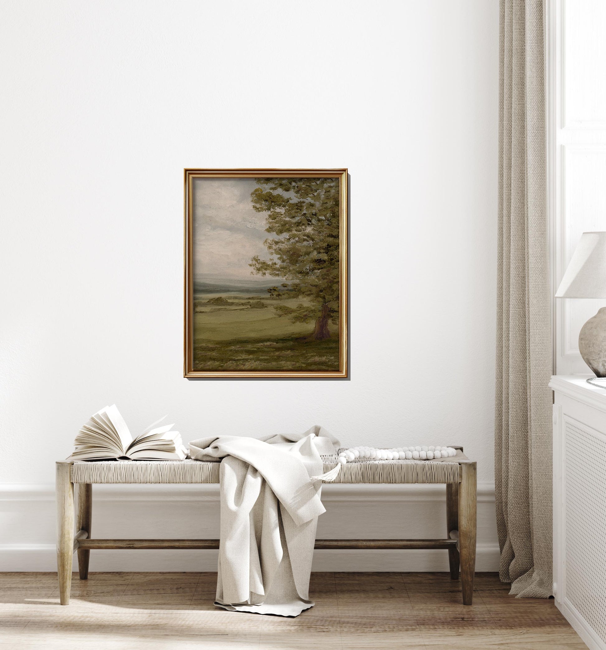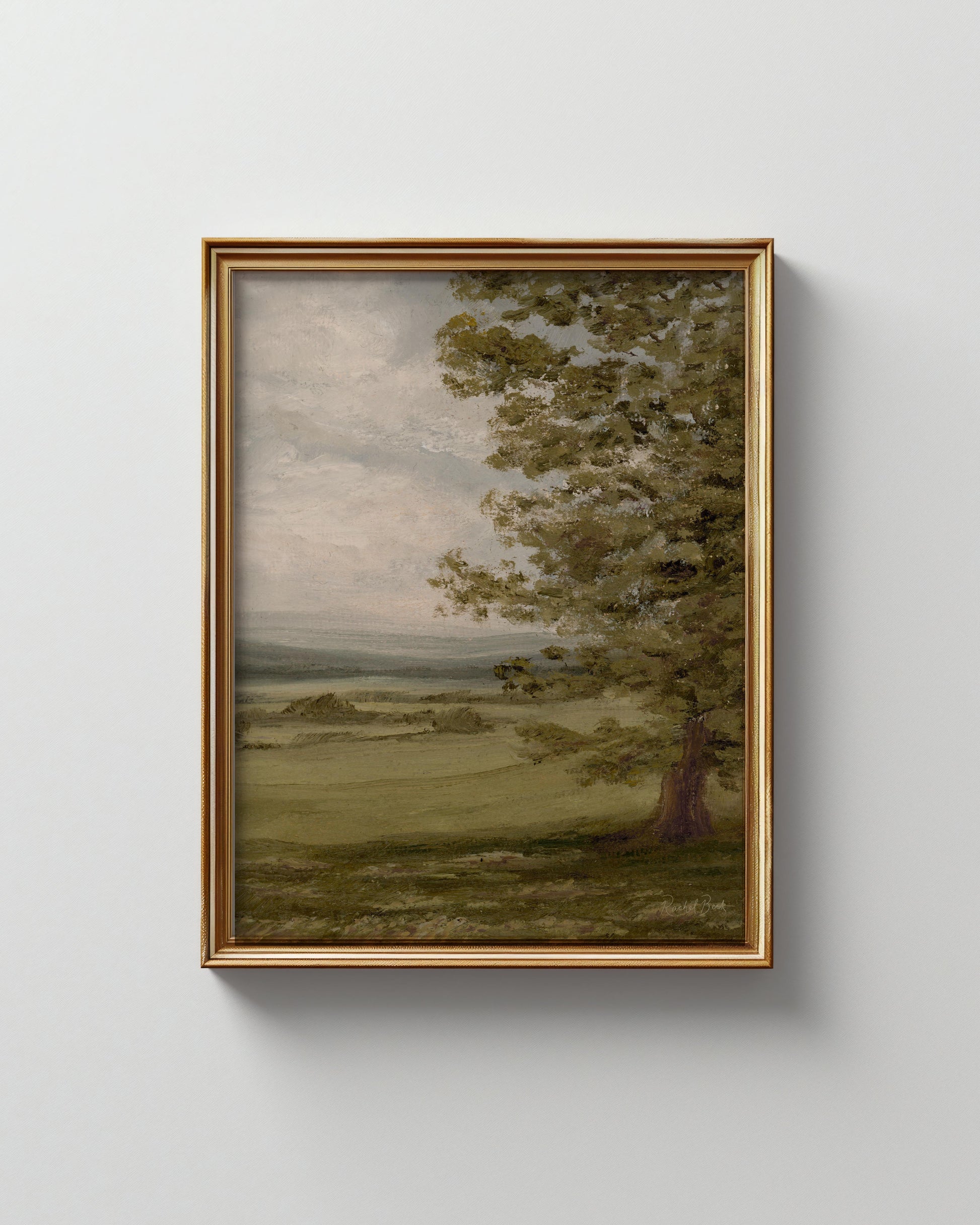 This is a reproduction of an original oil painting I created on Belgian linen. The giclee art is printed with archival pigment inks on canvas. Colors are in muted greens, browns, yellows and blue. The color can vary slightly from your screen to the finished art print.